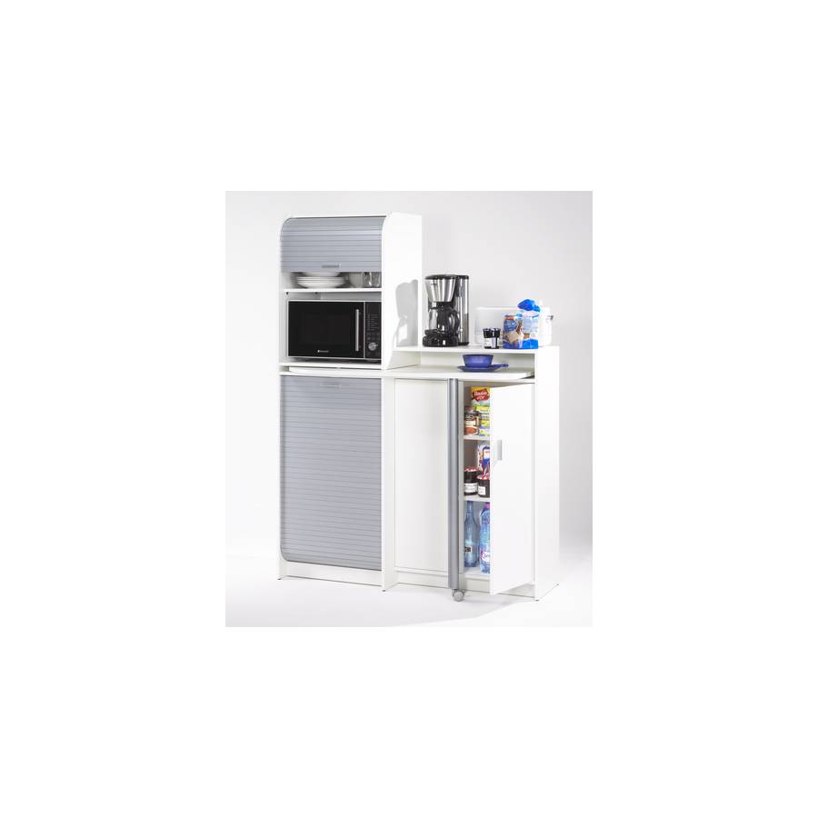 Meuble snack finition unique corps blanc et rideau argenté. Polyvalent et compact, il sera votre nouvel allié du coin café ou lors de votre pause déjeuner. Ouvert, partiellement fermé ou totalement clos, il conservera votre micro-ondes, votre machine à café, ainsi que les dosettes et tout ce qui vous permettra de faire une pause snack. Le plateau coulissant de 58 x 76 cm accueille la pause-café et déjeuner, et peut être...