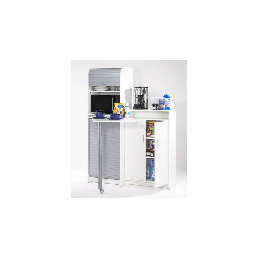 Voir plusMeuble snack finition unique corps blanc et rideau argenté. Polyvalent et compact, il sera votre nouvel allié du coin café ou lors de votre pause déjeuner. Ouvert, partiellement fermé ou totalement clos, il conservera votre micro-ondes, votre machine à café, ainsi que les dosettes et tout ce qui vous permettra de faire une pause snack. Le plateau coulissant de 58 x 76 cm accueille la pause-café et déjeuner, et peut être complété par des tabourets de bar. Le pied est équipé d’une roulette avec frein de blocage. Le faible encombrement et sa forme ergonomique permette de le positionner aisément contre un mur. Discret et élégant, il s’intègre aussi bien dans un couloir, un bureau ou dans une cuisine. Avec son meuble 2 portes, il apporte un rangement supplémentaire.