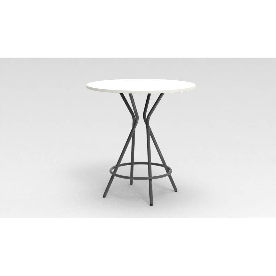Elle est composée d'une structure métallique avec repose pieds qui rend la structure plus stable et d'un piétement muni de 4 tubes en acier recouverts d'une peinture epoxy. 4 coloris sont disponibles : noir, argent, blanc et graphite. Pour finir, il suffit d'ajouter un plateau mélaminé ou stratifié d'une épaisseur de 25 mm. Différents coloris sont disponibles : graphite, blanc, gris, hêtre, chêne moyen, poirier, wengué, acacia clair, acacia foncé, chêne veiné, chêne grisé ou noir. Différents diamètres sont également possibles : 80 ou 100 cm au choix.