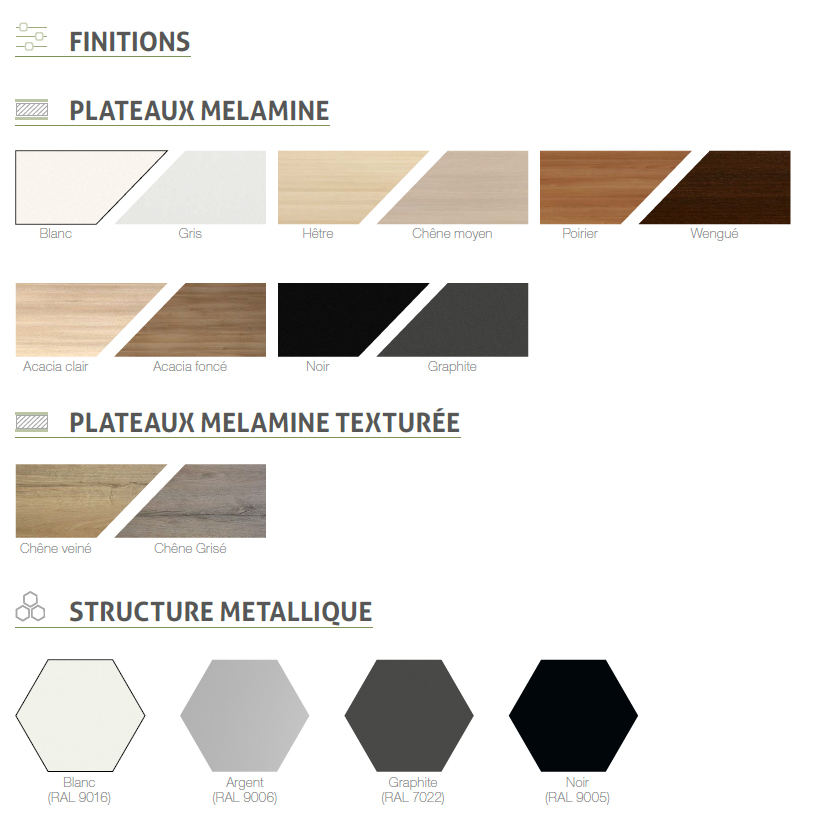 Elle est composée d'une structure métallique avec repose pieds et un pied carré de chaque coté en acier. 4 coloris sont disponibles : noir, argent, blanc et graphite et d'un plateau mélaminé ou stratifié d'une épaisseur de 25 mm. Différents coloris sont disponibles : graphite, blanc, gris, hêtre, chêne moyen, poirier, wengué, acacia clair, acacier foncé, chêne veiné, chêne grisé ou noir. Différentes longueurs sont possibles : 180 - 160 ou 120 cm au choix avec une profondeur de 80 cm.