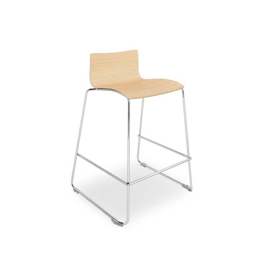 DANDY est un tabouret haut avec coque multicouches finition hêtre vernis naturel chêne. Il a 2 types de structure : 4 pieds et traineau en métal chromé. Fabrication européenne.
