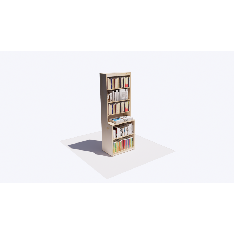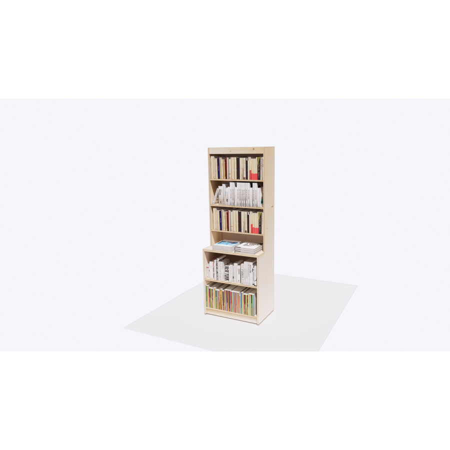 Bibliothèque 2 profondeurs en 3 plis épicéa épaisseur 22mm coloris naturel (autres coloris nous contacter) - Partie supérieure 1 niveau fixe + 2 tablettes sur taquets réglables en hauteur - Dessus fermé et bandeau haut (sans signalétique) - Partie inférieure 2 niveaux fixes + 1 tablette sur taquets réglables en hauteur - Fabrication dans notre usine en Bourgogne - Disponible en 2 longueurs 794mm et 1044mm - H 2200 x L 794 x P 518 mm partie inférieure et P 318 mm partie supérieure