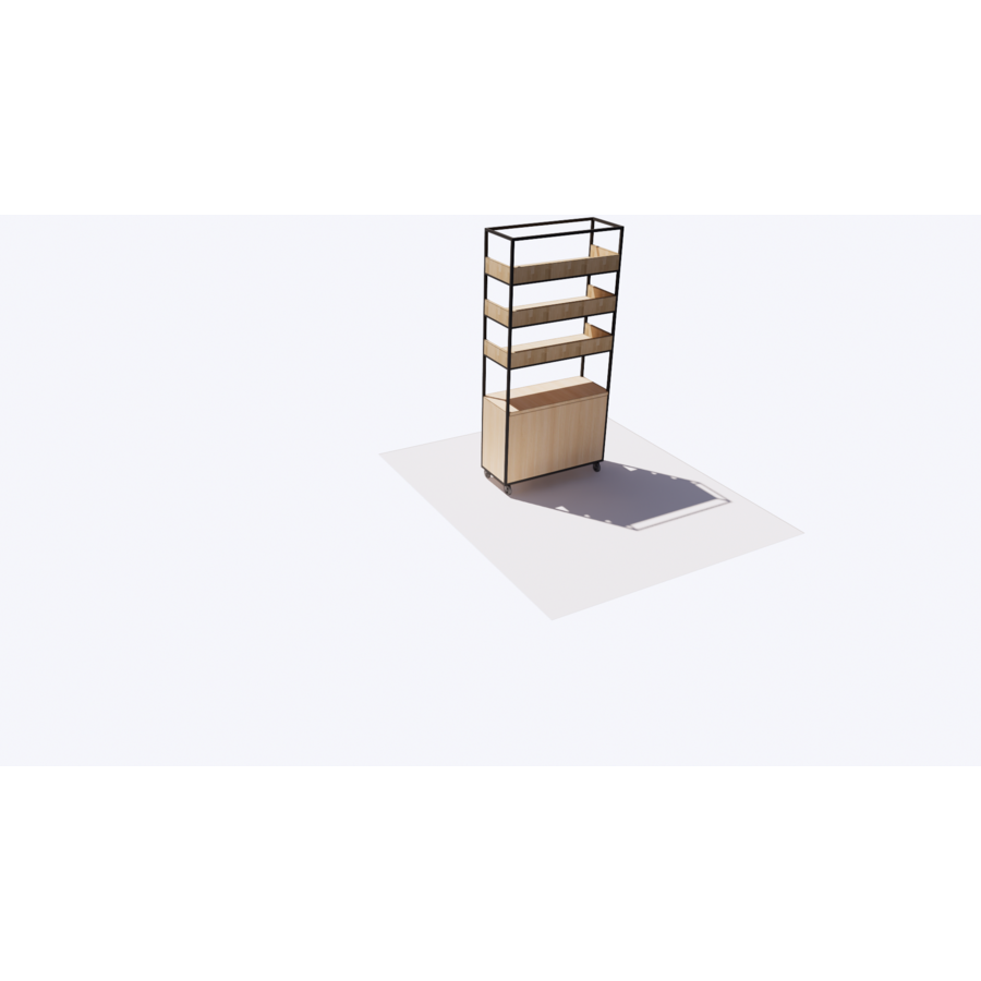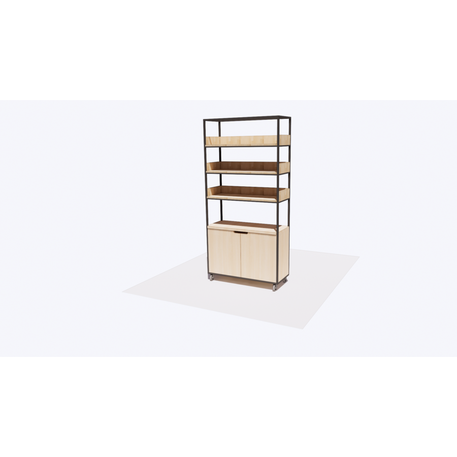 Bibliothèque-cloison sur roulettes en métal noir et bois coloris naturel (autres coloris nous contacter) - Caisson avec 2 portes battantes avec passe doigt en partie basse (dessus multiplis hêtre) - 3 niveaux d'étagères fixes en lamellé-collé pin en partie haute avec petits côtés et fond H 120 mm 4 roulettes pivotantes avec frein - Fabrication dans notre usine en Bourgogne - H 2100 x L 1000 x P 420 mm