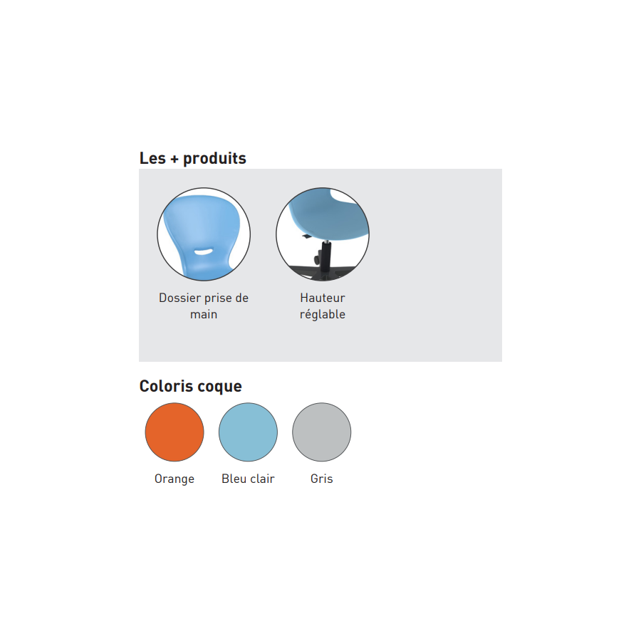 Doté d’une coque ergonomique en polypropylène avec prise de main, ce siège combine confort et praticité. Réglable en hauteur (H39 à 55 cm) grâce à un vérin à gaz, il repose sur un piètement robuste à 5 branches en polyamide avec des patins non tachants. Disponible en plusieurs coloris modernes (orange, bleu clair, gris), il est ignifuge (M4 pour la coque, M0 pour l’époxy) et garanti 5 ans. Livré monté pour une utilisation immédiate.