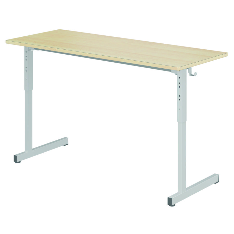 Cette table est à dégagement latéral et réglable en hauteur. Les pieds acier revêtus époxy sont démontables et sont fixés par vis permettant un montage rapide. Ils sont équipés de vérins réglables en hauteur non-marquants et non-tachants. Il est possible d'ajouter en options un casier en tôle sous plateau et/ou un crochet porte cartable par personne.