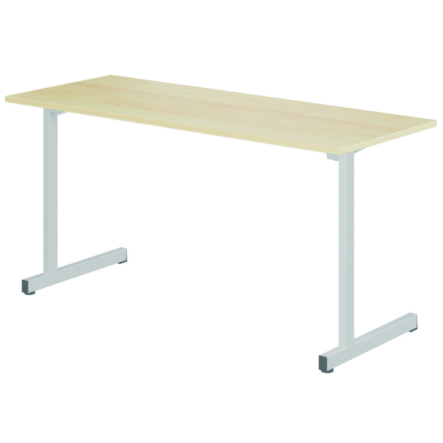 Cette table est à dégagement latéral. Les pieds acier revêtus époxy sont démontables et sont fixés par vis permettant un montage rapide. Ils sont équipés de vérins réglables en hauteur non-marquants et non-tachants. Il est possible d'ajouter en options un casier en tôle sous plateau et/ou un crochet porte cartable par personne.