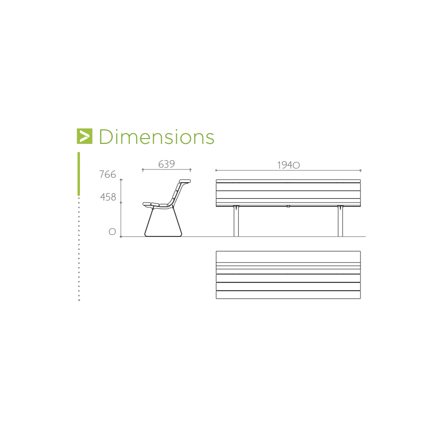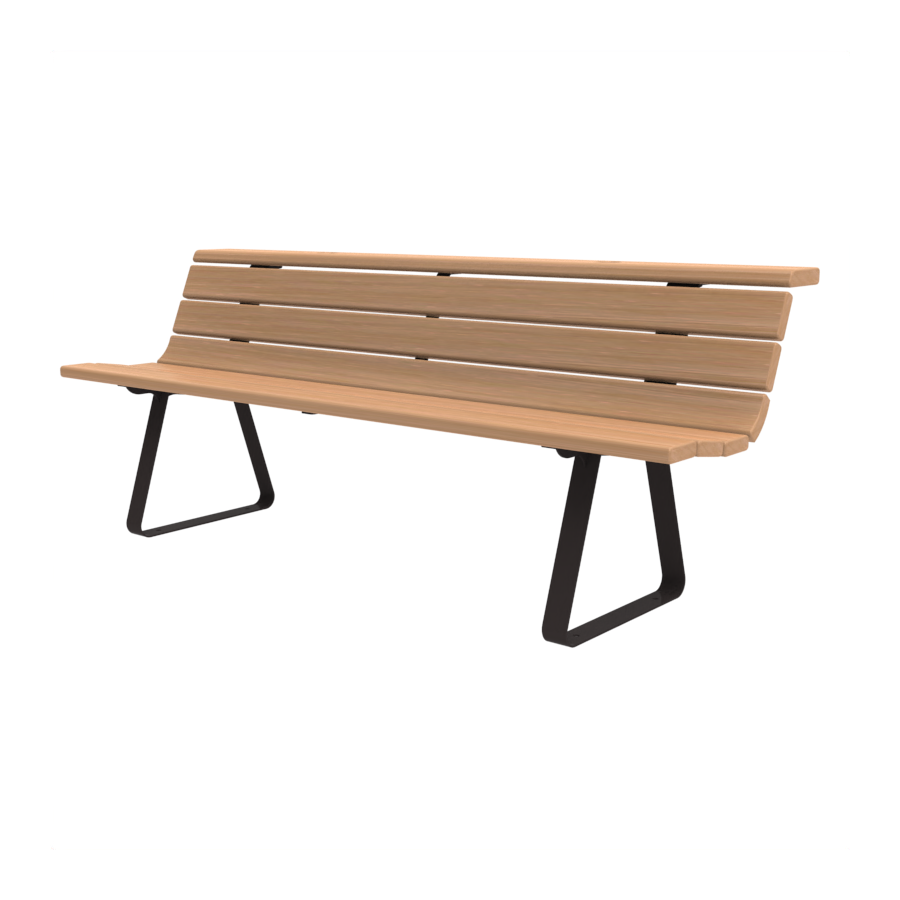 Adoptez pour vos espaces publics le banc d'extérieur 3 places Azur Tab‘ composé de 2 piétements, de 5 lattes en bois, d’une latte incurvée, d’une latte en extrémité supérieure et d‘un renfort médian.