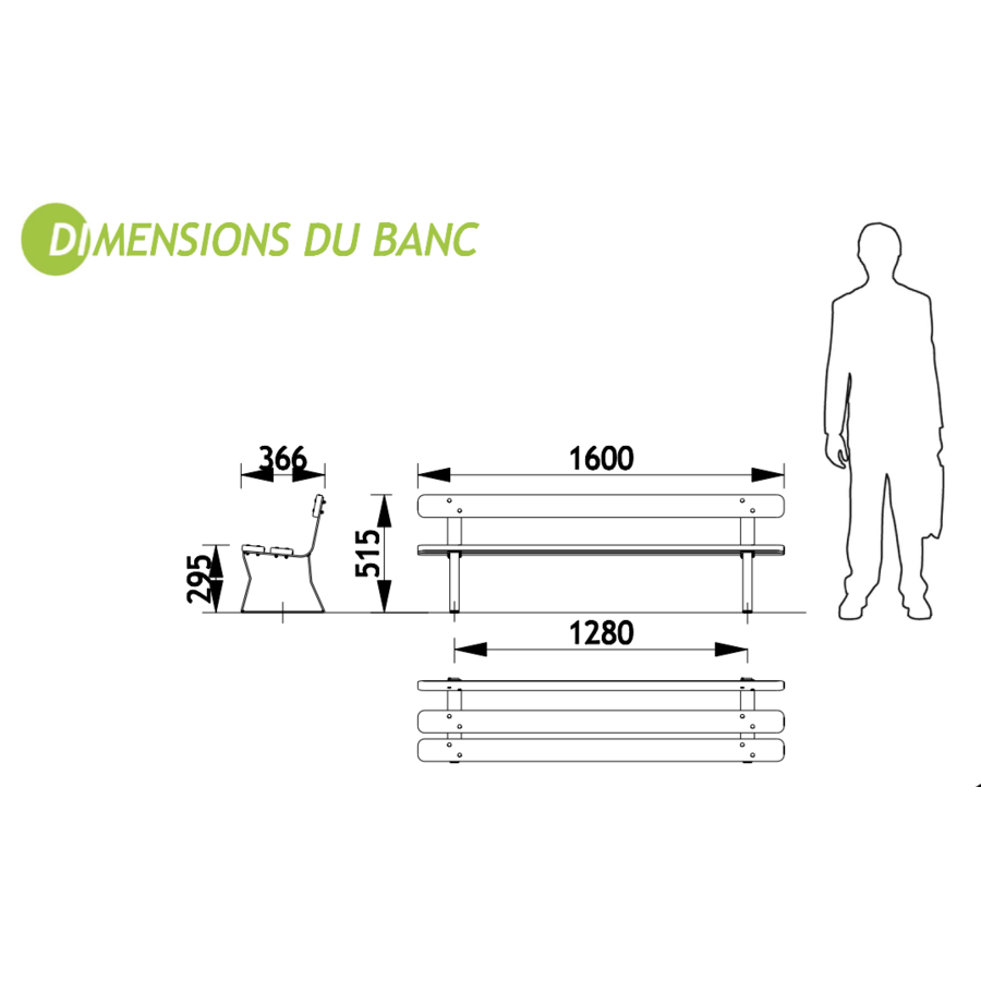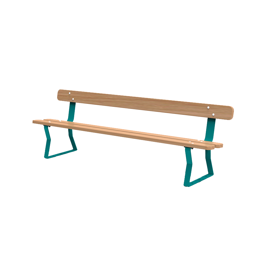 L'assise et le dossier du banc sont composés de 3 lattes de bois munis d'extrémitées arrondies et dont le bois est issu de forêts gérées durablement qualifiées PEFC ou FSC