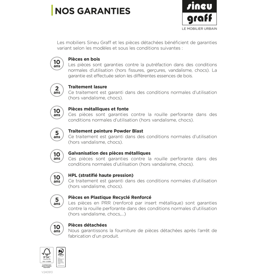 Les mobiliers TANGO CITY sont composés de garnitures et de piètements en acier. Les garnitures sont composées de tiges Ø 10 mm soudées sur des plats d’extrémité, de renforts et de deux profils pliés arrondis à l’avant des assises et sur le haut des dossiers .