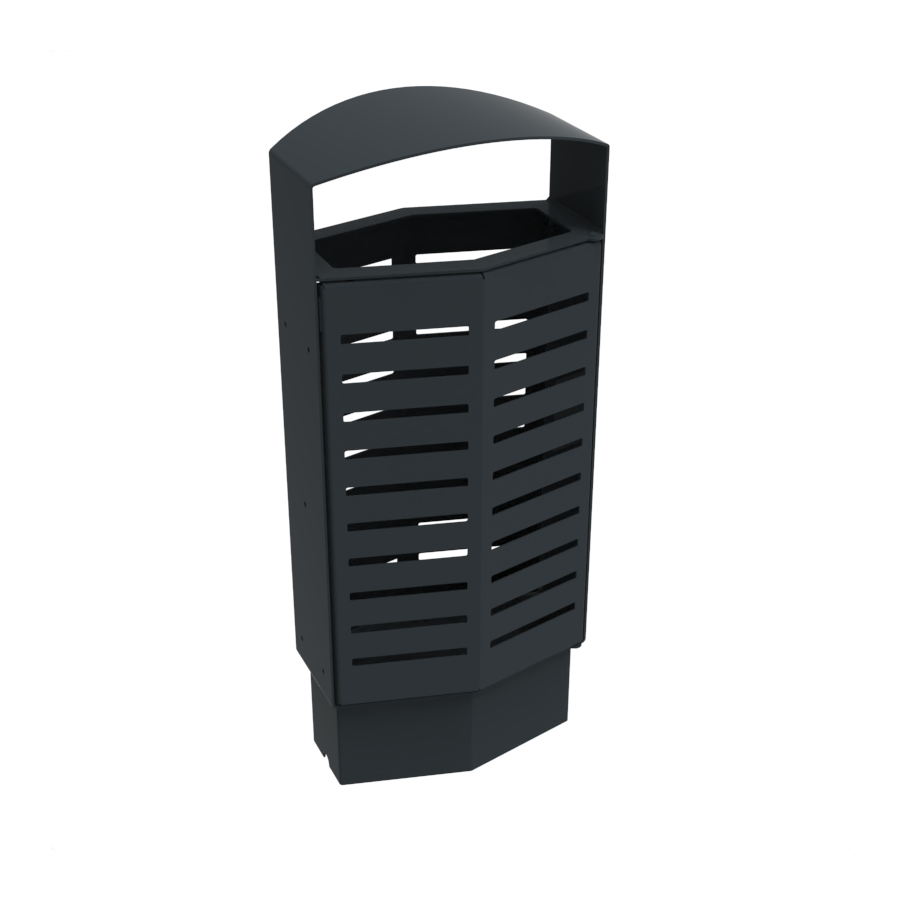 La corbeille de propreté se compose d’une ossature réalisée en tôle d’acier formant les montants latéraux, le dessus et le fond de la corbeille. Cette ossature comporte en son dessus les découpes permettant la mise en place d’un cendrier dôme, d’un tri sélectif ou d’un distributeur de sacs canins, un fond plat et un flasque reliant les montants en partie haute délimitant la zone de dépose des déchets, et destinée également à fixer la tôle arrière ainsi que la porte retenue en position fermée par un aimant.