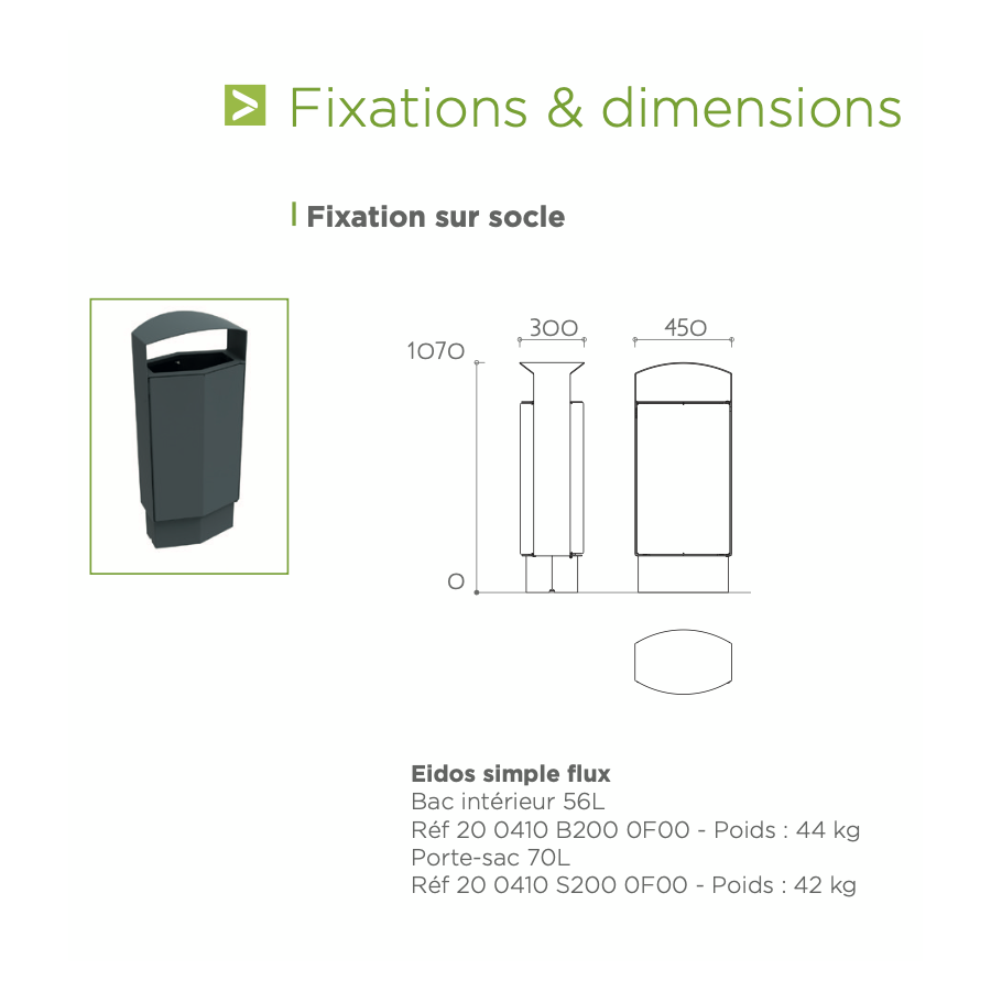 Corbeille 70 Litres simple flux Eidos Evolution porte sac fixation sur socle