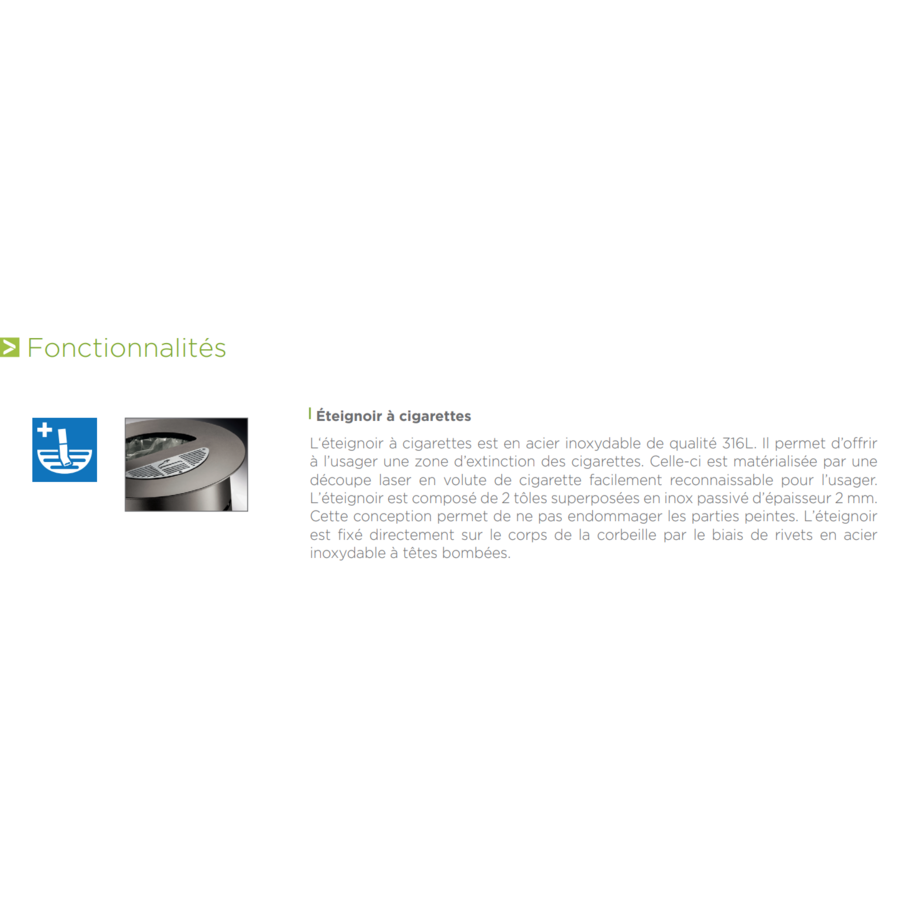 Les découpes larges et rythmées de cette corbeille de propreté Contemporaine Evolution lui confèrent légèreté et élégance et permettent de répondre aux exigences du plan vigipirate. Elle est dotée d'un éteignoir à cigarettes.