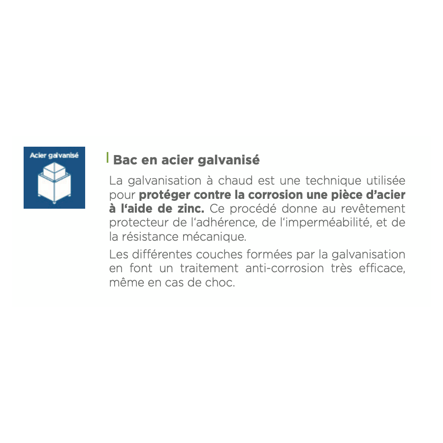 Pour une protection optimale contre la rouille et une performances durable, les éléments en acier sont traités par zingage puis selon notre process Powder Blast (après nettoyage et grenaillage, les pièces sont revêtues d’une première couche de poudre époxy, et d’une deuxième couche de poudre polyester).