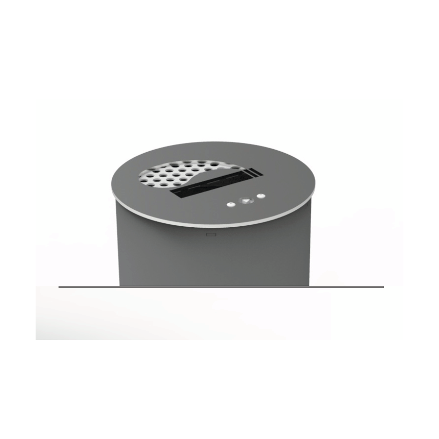 Le Mégotier Contemporain avec seau 16 Litres, de forme ronde est pourvu d'un couvercle en acier inoxydable électropoli et d'un corps en acier zingué peint. La découpe cigarette réalisée au laser permet d'écraser la cigarette puis d'y insérer le mégot. Le cendrier est équipé d’une serrure à empreinte triangulaire.
