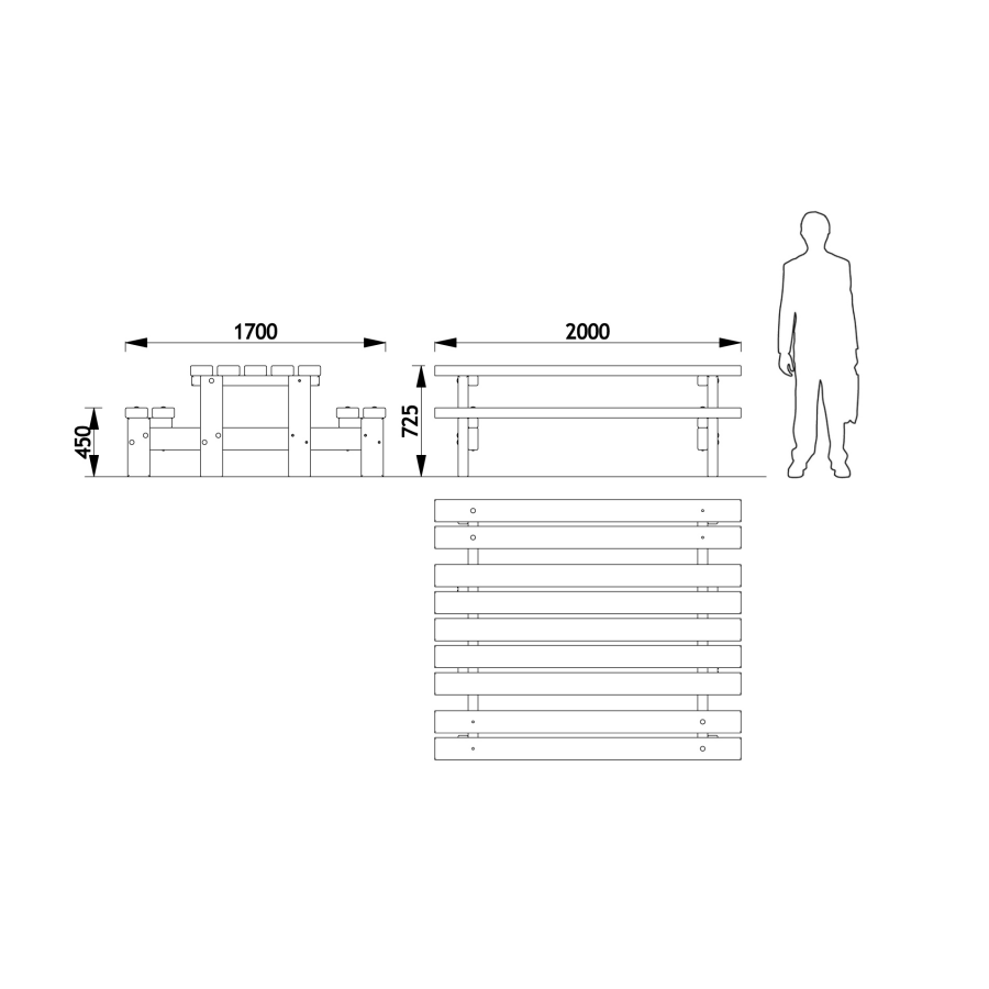 Les planches du plateau, des assises et des piètements sont en bois de section 65 x 145 mm. Les traverses de renfort sont en bois de section 65 x 65 mm. Le plateau assemblé par tire-fonds.