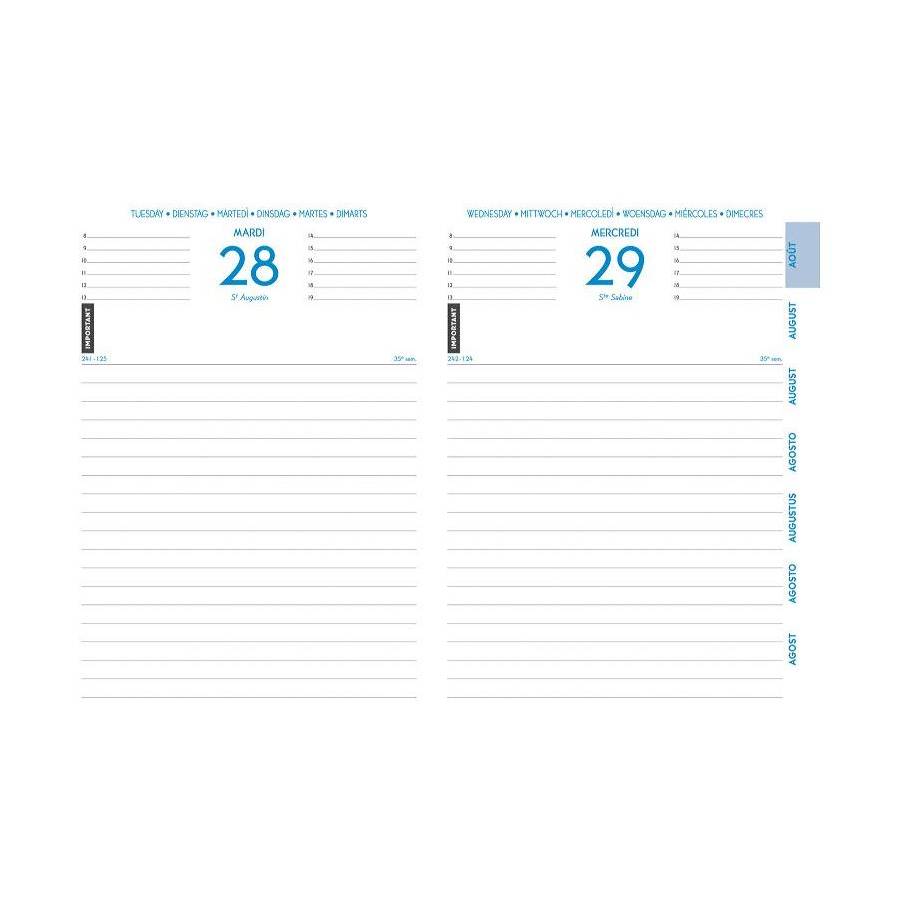 Agenda journalier Forum Winner 12x17 cm Août à Juillet 1 jour par page Multilingue, papier blanc impression en bleu Couverture amovible au toucher doux, impression en creux motif chiffres Imprim Vert PEFC 100% L'incontournable au toucher doux