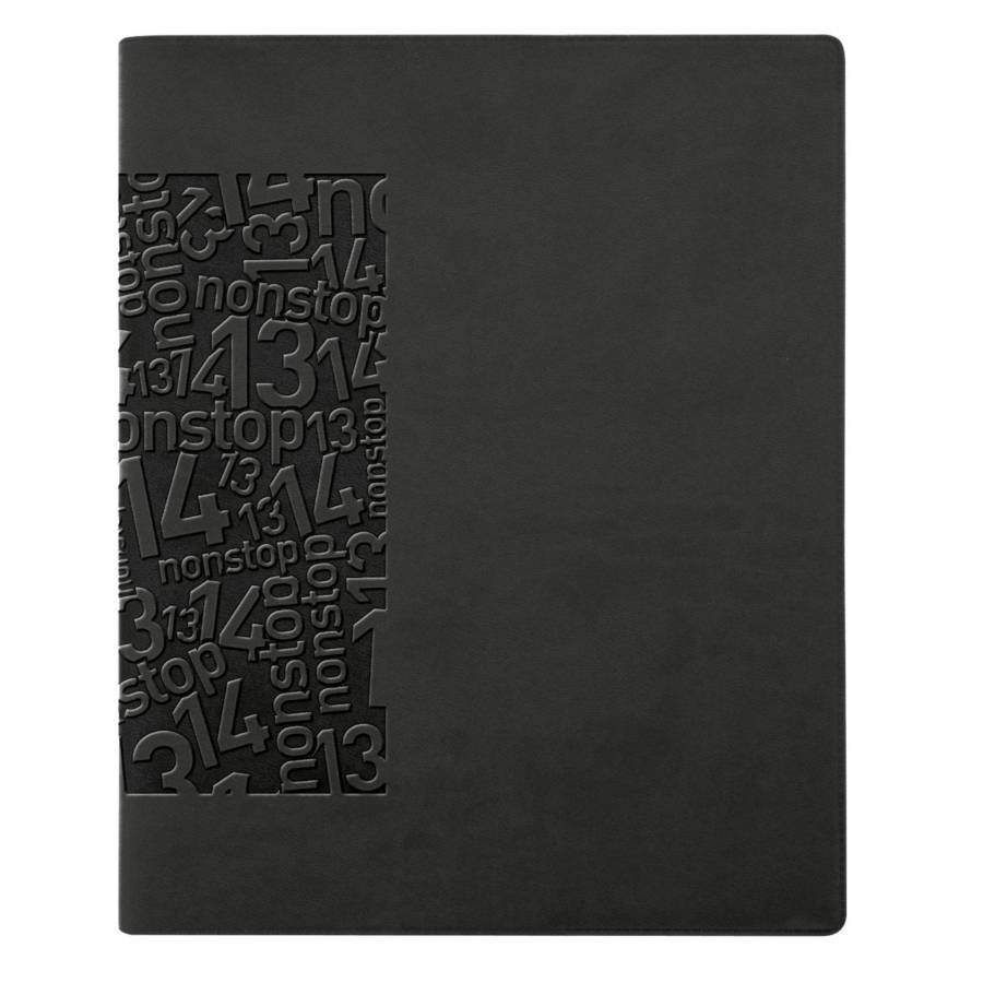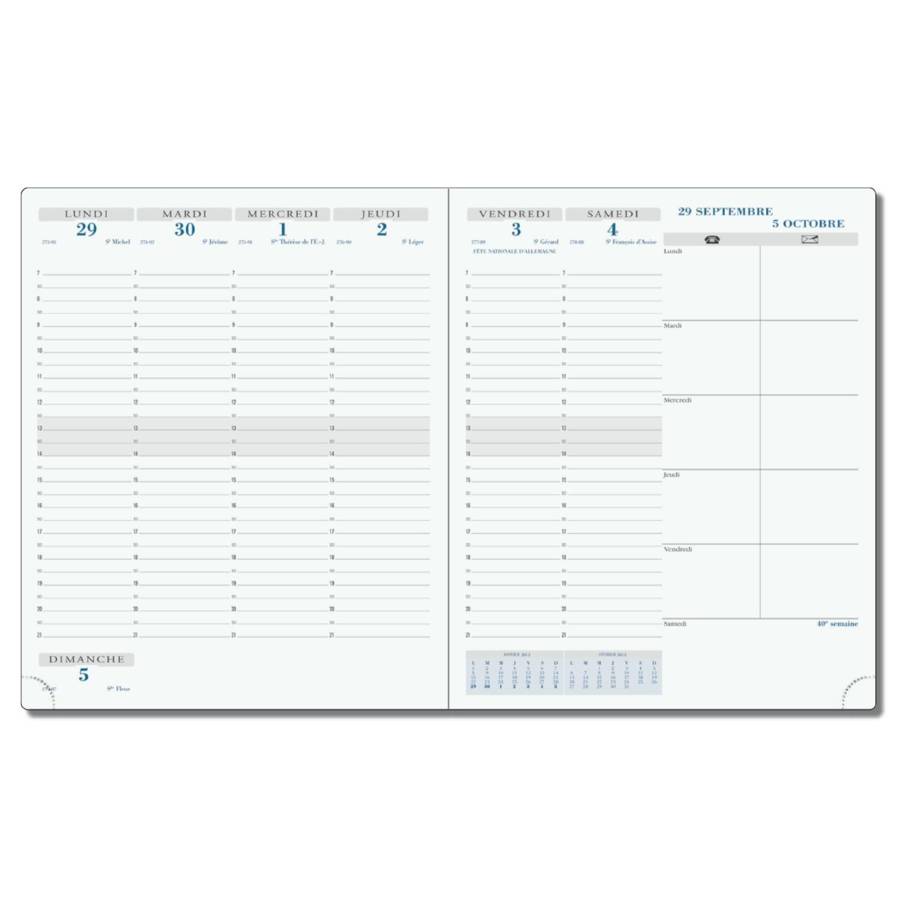 Agenda semainier de bureau 27x21 Août à Août La semaine sur 2 pages à la verticale Papier bleuté avec impression en bleu et gris Répertoire téléphonique amovible Couverture amovible au toucher doux, impression en creux motif nombres Imprim Vert PEFC 100% L'incontournable au toucher doux