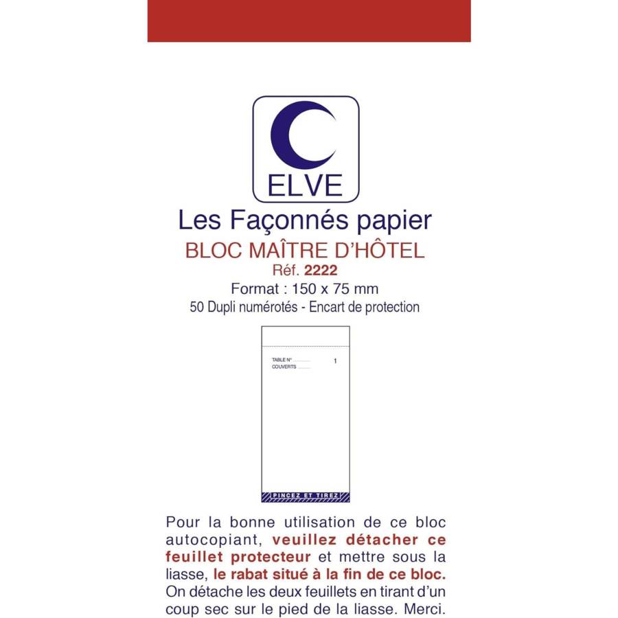 Bloc Maitre D'hotel 75x150mm 50 Feuillets Autocopiant Dupli Détachable Fabrication 100% Française