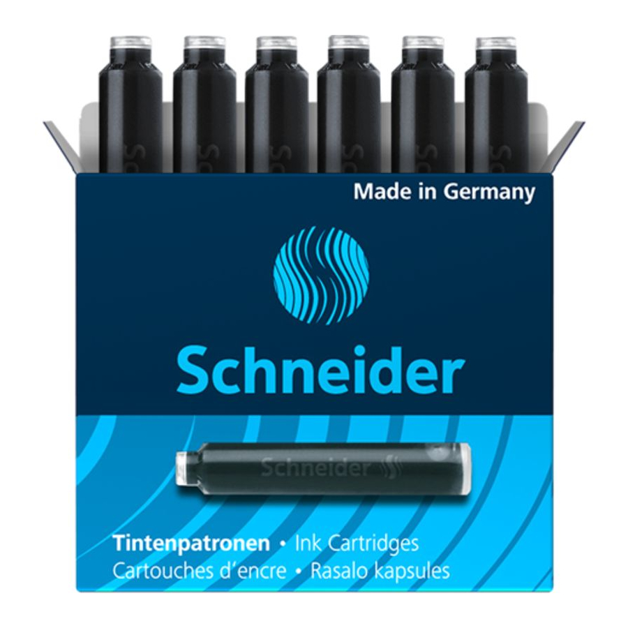 Six cartouches d´encre fermées à l´aide d´une bille, encre noire. Convient aux produits Schneider et à la plupart des stylos à plume et rollers à cartouche.