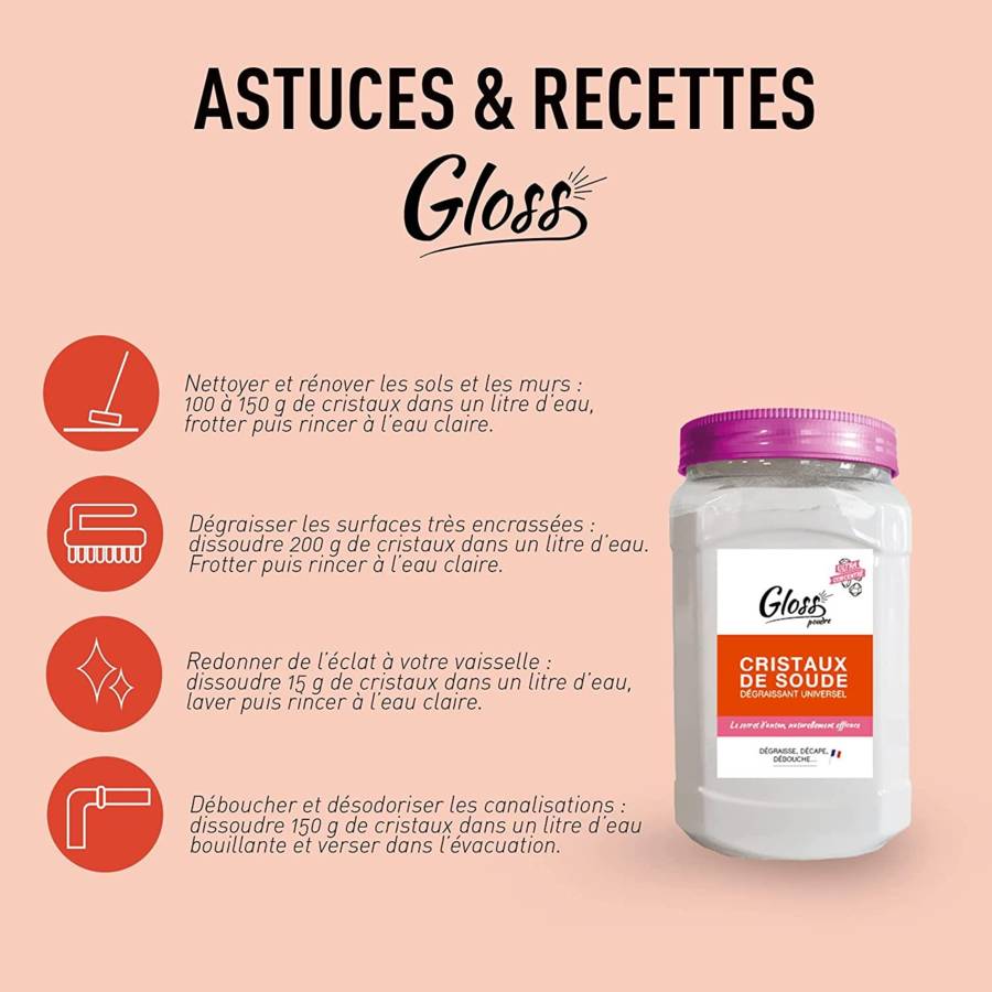 Voir plusNETTOIE DEGRAISSE ET DECRASSE toute la maison Idéal pour les petits et gros travaux : nettoyage de terrasses, décapage des peintures ou papiers peints… Nettoyant multi usages : salle de bain (lavabo, douche, baignoire, toilettes), cuisine, (plans de travail, évier, hotte, four, gazinière, casseroles brûlées, meubles de cuisine), carrelages, marbre, PVC, murs, terrasses etc. FORMULE EN POUDRE & 100% NATURELLE : Formule sans allergènes étiquetables, sans colorant et sans conservateur. Compatible contact alimentaire et méthode HACCP. MODE D'EMPLOI - Nettoyer et rénover les sols et les murs : 100 à 150 g de cristaux pour 1L d'eau, frotter puis rincer à l'eau claire. - Dégraisser les surfaces très encrassées : dissoudre 200 g de cristaux dans un litre d'eau. Frotter puis rincer à l'eau claire. - Redonner de l'éclat à votre vaisselle : dissoudre 15 g de cristaux pour 1L d'eau, laver puis rincer à l'eau claire. - Déboucher et désodoriser les canalisations : dissoudre 150 g de cristaux pour 1L d'eau bouillante et verser dans l'évacuation. TOUT EST PROPRE TOUT EST CLAIR: GLOSS, ce sont des produits d'antan et naturels, efficaces, faciles à utiliser, bons pour votre intérieur, pour votre santé et pour notre planète. Essayez les en poudres dans vos recettes DIY, en prêt à l'emploi 750ml ou en bidon de 5 ou 10L DES PRODUITS MADE IN FRANCE : tous les produits GLOSS sont conçus et fabriqués en France