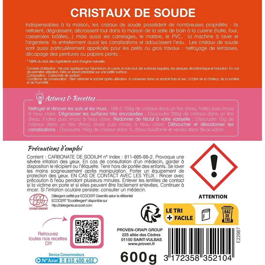 Boîte 600 g Cristaux de soude - Dégraisse, décape, débouche - Formule concentrée