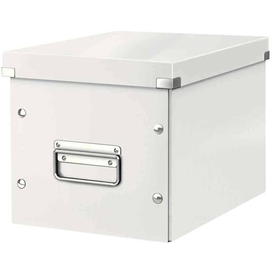 LEITZ Boîte de rangement Click & Store WOW Cube M, blanc carton rigide avec revêtement en PP, montage avec boutons poussoirs, protections des bords nickelés, avec poignée et porte-étiquette, étiquette incluse, empilable, dimensions: (L)260 x (P)260 x (H)310 mm