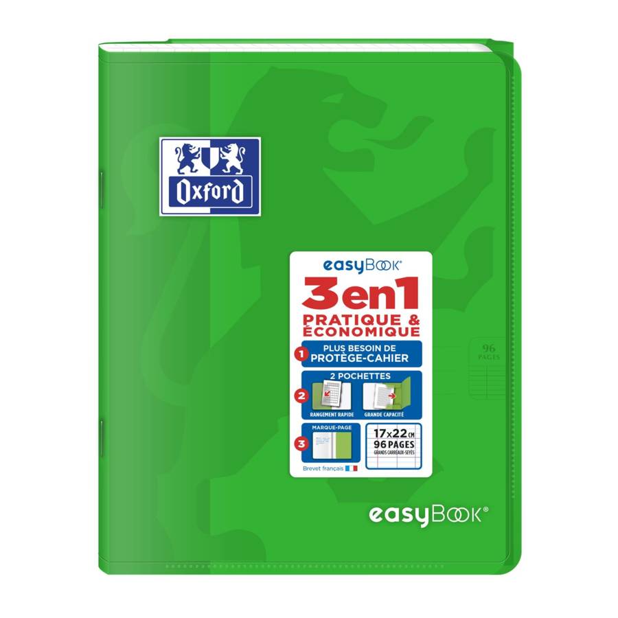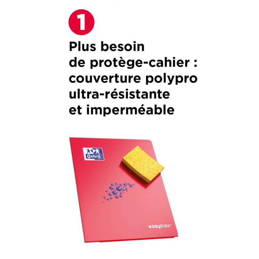 Voir plusAvec easyBook®, Oxford vous propose un cahier polypro 3 en 1 unique, à la fois ultra résistant, pratique et économique ! Grâce à sa couverture polypro, vous n'avez plus besoin de protège-cahier. 2 pochettes de rangement sont prévues pour stocker tous les documents distribués en cours et une page de garde vous permet d'identifier votre cahier. easyBook® est également doté d'un rabat marque-page pour retrouver facilement ses notes et les protéger. easyBook® Oxford est le cahier polypro 17x22 96 pages grands carreaux Seyès incontournable de la rentrée scolaire ! FORCES COUVERTURE: Plus besoin de protège-cahier avec EasyBook ! La couverture plastique est ultra-résistante et imperméable. RANGEMENT : Une pochette 3 rabats à grande capacité est située à l'arrière du cahier. Elle permet de stocker et de transporter tous ses polycopiés et autres documents. ORGANISATION : Une pochette plastique est intégrée à l'avant du cahier pour ranger temporairement des documents importants ou customiser sa couverture. RABAT : Un rabat marque-page, situé en fin de cahier, permet de retrouver ses notes rapidement et les protéger. PAGE DE GARDE : Une page de garde blanche est située derrière la couverture translucide et cache la réglure Seyès. Elle permet aussi d'identifier son cahier en écrivant la matière. REGLURE : la réglure à grands Carreaux Seyès, en 2 couleurs, assure une meilleure lisibilité pour l'élève. Elle permet de réduire l'effet de la fatigue visuelle, tout en améliorant efficacement la concentration. CARACTÉRISTIQUES Format scolaire - Largeur : 17cm x Hauteur : 22cm Réglure à grands carreaux Seyès en 2 couleurs avec une marge à gauche 96 pages - Qualité Optik Paper, un papier 90g satiné extra blanc Couverture plastique translucide, en polypropylène Reliure agrafé