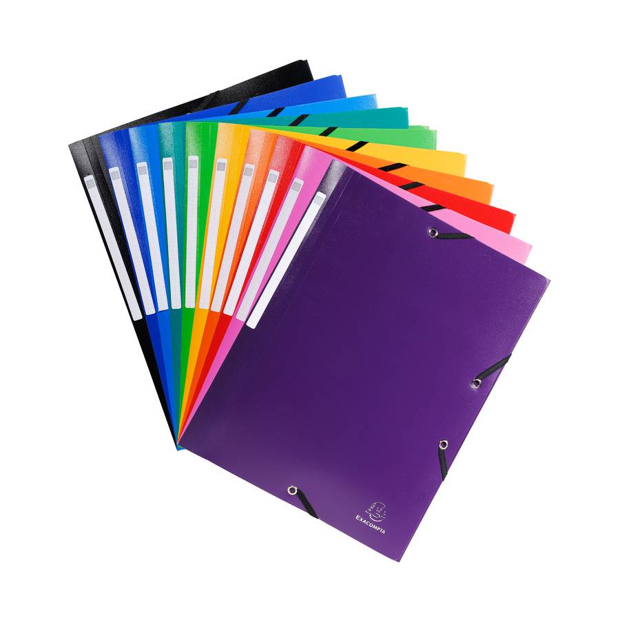 EXACOMPTA Polypropylène souple et opaque pour protéger et conserver la confidentialité des documents. Etiquette de dos pour identifier les dossiers. Large choix de coloris mode. Couleur(s) : Couleurs assorties Gamme : Opaque Nombre de couleurs assorties : 10 Couleur des élastiques : Noir Matière : PP Épaisseur : 5/10e Format à classer : A4 Type de produit : Chemise Type de chemises : 3 rabats et élastiques Étiquette au dos : Oui Type de sangle : sans Capacité (feuillets 80gr.) : 200 Format extérieur : 24x32cm Fermeture : Avec élastiques et 3 rabats