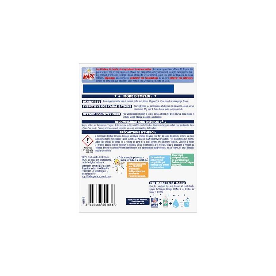 Les Cristaux de Soude St Marc constituent un dégraissant puissant et un nettoyant multi-fonctions, ils sont indispensables pour fabriquer vos produits pour la maison. Entretien canalisation, dégraissant, nettoyant four ou même nettoyant exterieur.