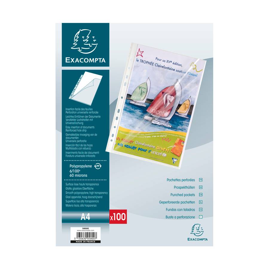 Boîte de 100 pochettes perforées - Ouverture sur 2 côtés haut et côté pour une insertion et un retrait facile et rapide des documents. PERFORATION : Européenne de 11 trous - Bande de renfort blanche. En polypropylène lisse épaisseur 6/100ème - Surface lisse haute transparence. Elles permettent une meilleure lisibilité des documents pour un usage quotidien. Le format des pochettes, légèrement plus grand que le format A4, est spécialement étudié pour que les documents A4 s'y insèrent correctement et facilement - Dimensions : 23 x 30,5 cm. CONDITIONNEMENT : en boîte de 100 pochettes perforées - Fabrication 100% française - Transparente.