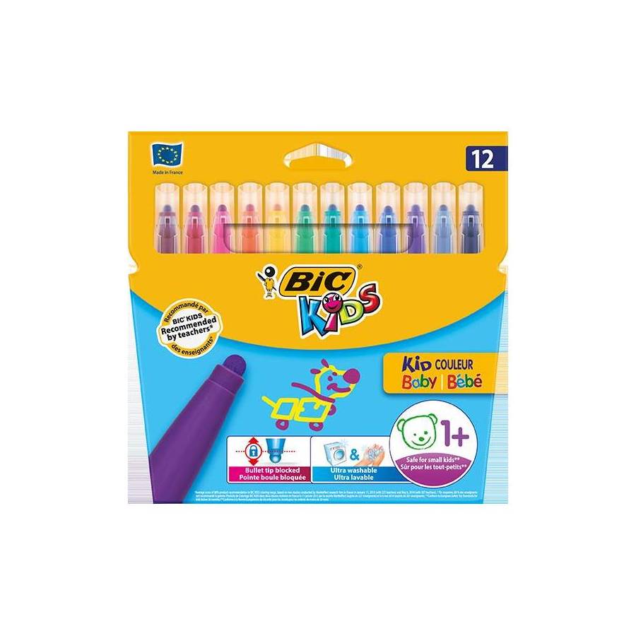 BIC Etui carton de 12 feutres de coloriage KIDS COULEUR BABY Pte Boule Bloquée 4,5 mm 12 Couleurs