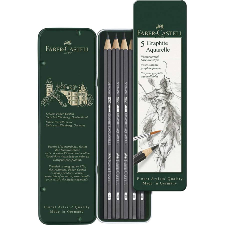 Faber-Castell Étui de 5 crayons Graphite Aquarelle Le crayon de papier soluble à l'eau GRAPHITE AQUARELLE est idéal pour dessiner des esquisses préparatoires d'aquarelles et des aquarelles complètes réalisées avec un crayon de papier. Équipé d'une mine de 3,3 mm résistante à la casse. Disponible dans les cinq intensités de dureté usuelles, c'est-à-dire HB, 2B, 4B, 6B et 8B. Vernis écologique à l'eau Mine particulièrement résistante grâce à un collage spécial Se prête parfaitement aux dessins aquarelles classiques, aux ébauches pour les peintures acryles ou à l'huile ou aux travaux Mixed Media