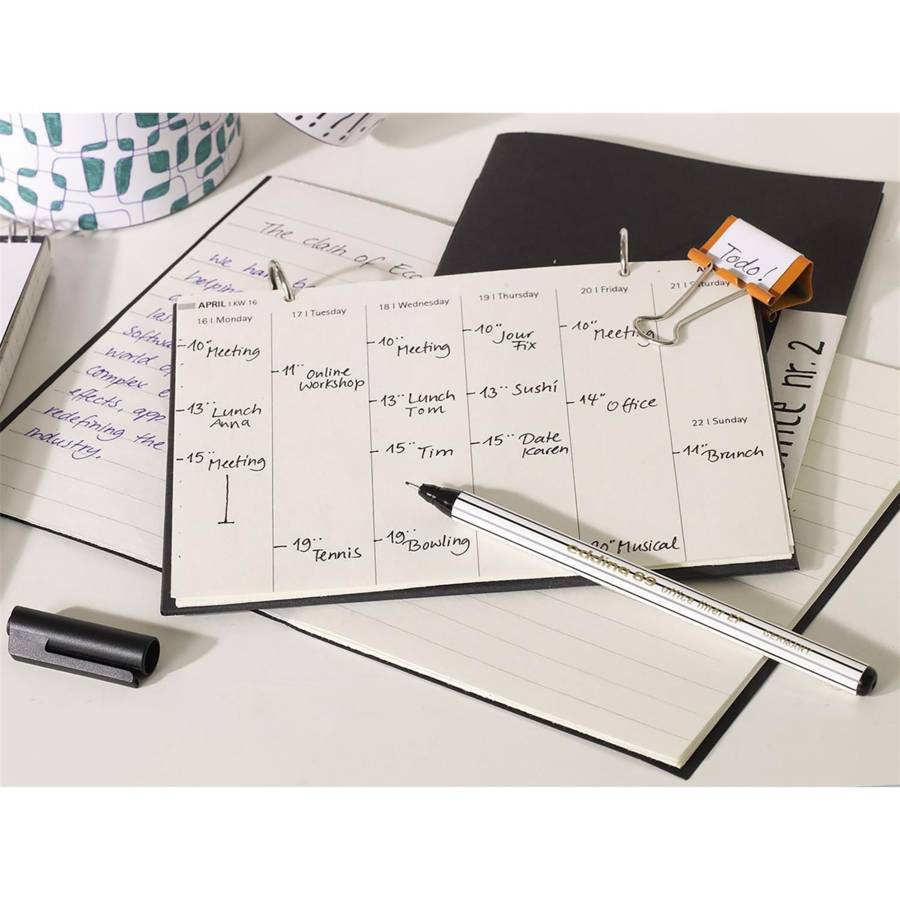 Quand on manque de place, la meilleure façon d'y parvenir, c'est d'utiliser le feutre fin edding 89 Office Liner, dont la pointe gainée de métal au tracé très fin permet de mettre par écrit même les situations les plus complexes sur un espace réduit
