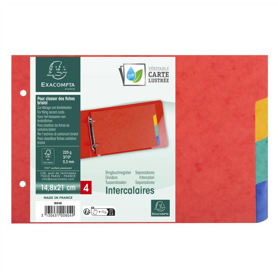 Intercalaires pour fiches bristol carte lustrée 225g/m2 4 positions - A5 148x210mm Intercalaires en véritable carte lustrée pour fiches bristol. La Véritable Carte Lustrée est plus résistante, plus durable et permet un usage intensif. Elle est certifiée FSC