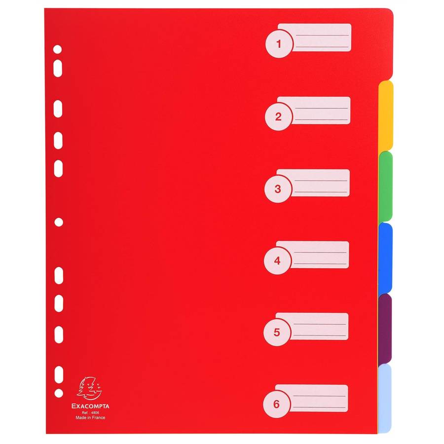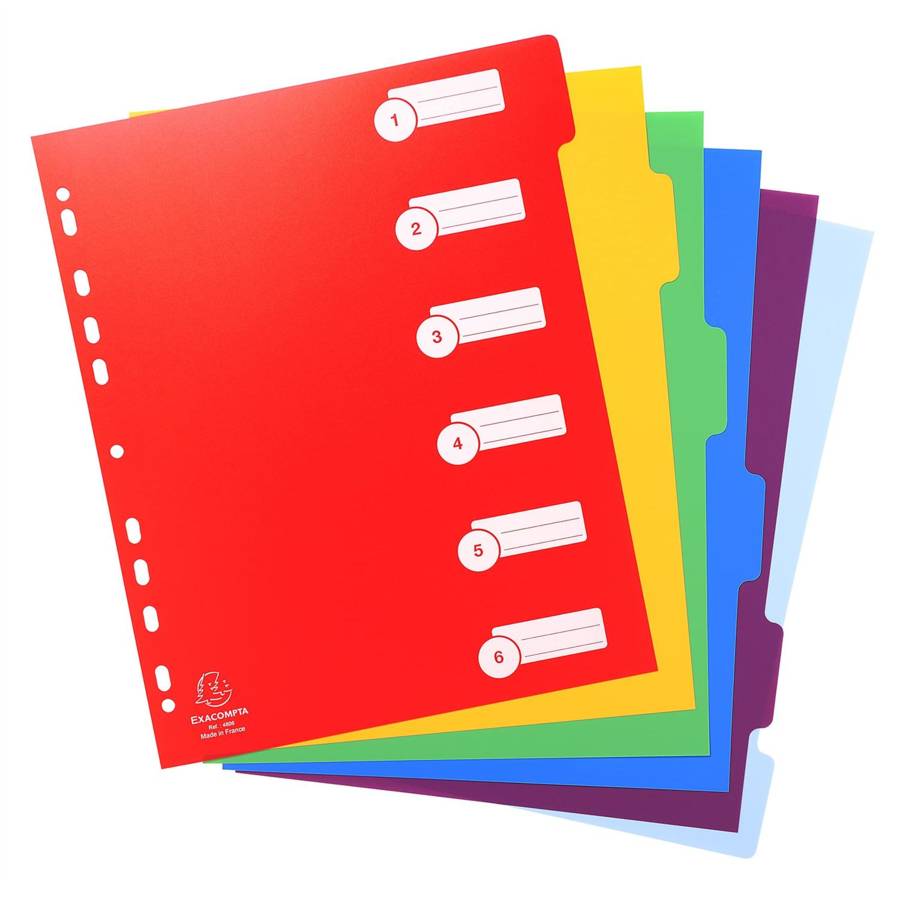 ntercalaires à onglets neutres en polypropylène rigide opaque coloris vifs Premier index imprimé avec des zones blanches pour noter le contenu de chaque onglet. On peut écrire sur les onglets à l'aide d'un stylo bille et effacer NOMBRE D'ONGLETS : 6 FORMAT A CLASSER : A4 MAXI - Dimensions 24,5 x 29,7 cm - Les intercalaires en format A4 MAXI sont destinés aux feuillets de format 210x297 mm et permettent l'utilisation de pochettes perforées sans que celles-ci ne dépassent des onglets.