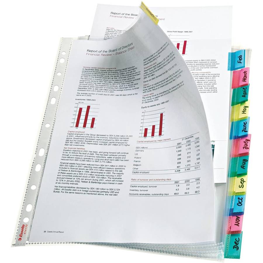 Esselte - Jeu de pochettes intercalaires 12 positions à onglets, en polypropylène 9/100e Combinaison d'une pochette et d'intercalaires de qualité. Convient au classement dans les classeurs à levier et les classeurs à anneaux grâce à sa bande perforée Organisation et rangement facile des documents avec les 12 feuilles intercalaires qui peuvent également s'utiliser comme des pochettes. En polypropylène 0,13 mm, lisse, copysafe Ouverture en haut Perforation 11 trous pour utilisation universelle Pour format A4
