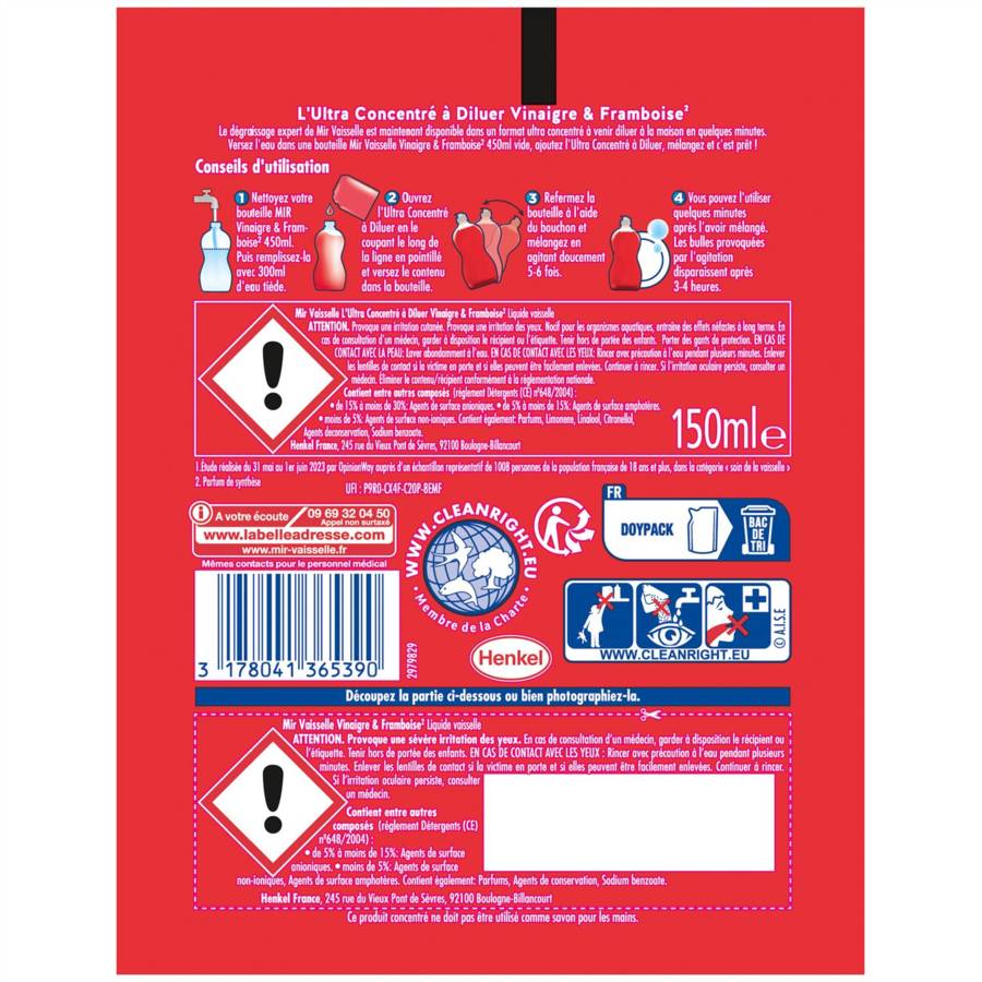 Le dégraissage expert de Mir Vaisselle est maintenant disponible dans un format ultra concentré à venir diluer à la maison en quelques minutes. Versez l'eau dans une bouteille Mir Vaisselle Vinaigre et Framboise* 450 ml vide, ajoutez l'Ultra Concentré à Diluer, mélangez et c'est prêt ! Vous pouvez l'utiliser quelques minutes après l'avoir mélangé. *Parfum de synthèse
