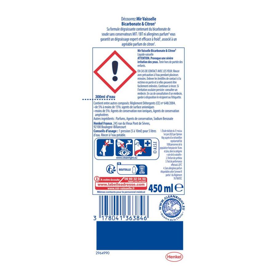 Mir Vaisselle Bicarbonate & Citron** est un liquide vaisselle facilement reconnaissable à sa couleur jaune. Il met en action l'efficacité de Mir, associée aux propriétés dégraissantes du bicarbonate de soude et au doux parfum de citron**. Sa formule efficace à froid*** vous garantit un résultat impeccable grâce à ses puissants ingrédients dégraissants et ses traditionnelles vertus nettoyantes. Mir contribue au respect de l'environnement avec ses engagements forts: emballages comportant au moins 84% de matières recyclées.