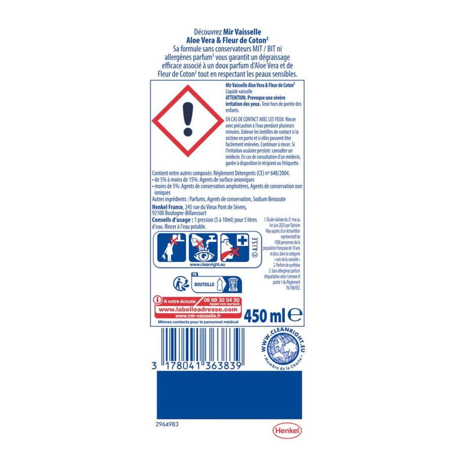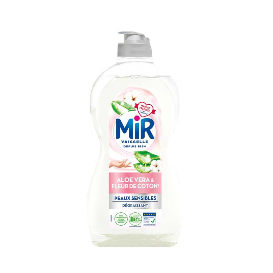 Voir plusMir Vaisselle Fleur de Coton Aloe Vera** est un liquide vaisselle facilement reconnaissable à sa couleur blanche. Il met en action l'efficacité de Mir, associée aux propriétés dégraissantes et au doux parfum d'Aloe Vera & Fleur de Coton**. Sa formule est spécifiquement développée pour laver votre vaisselle avec un résultat impeccable grâce à ses puissants ingrédients dégraissants et ses traditionnelles vertus nettoyantes. Mir Vaisselle Aloe Vera & Fleur de Coton** ne contient pas de MIT, BIT ni allergènes parfum***et est certifié Ecarf pour le respect de votre peau. Mir contribue au respect de l'environnement avec ses engagements forts: emballage comportant au moins 84% de matières recyclées.