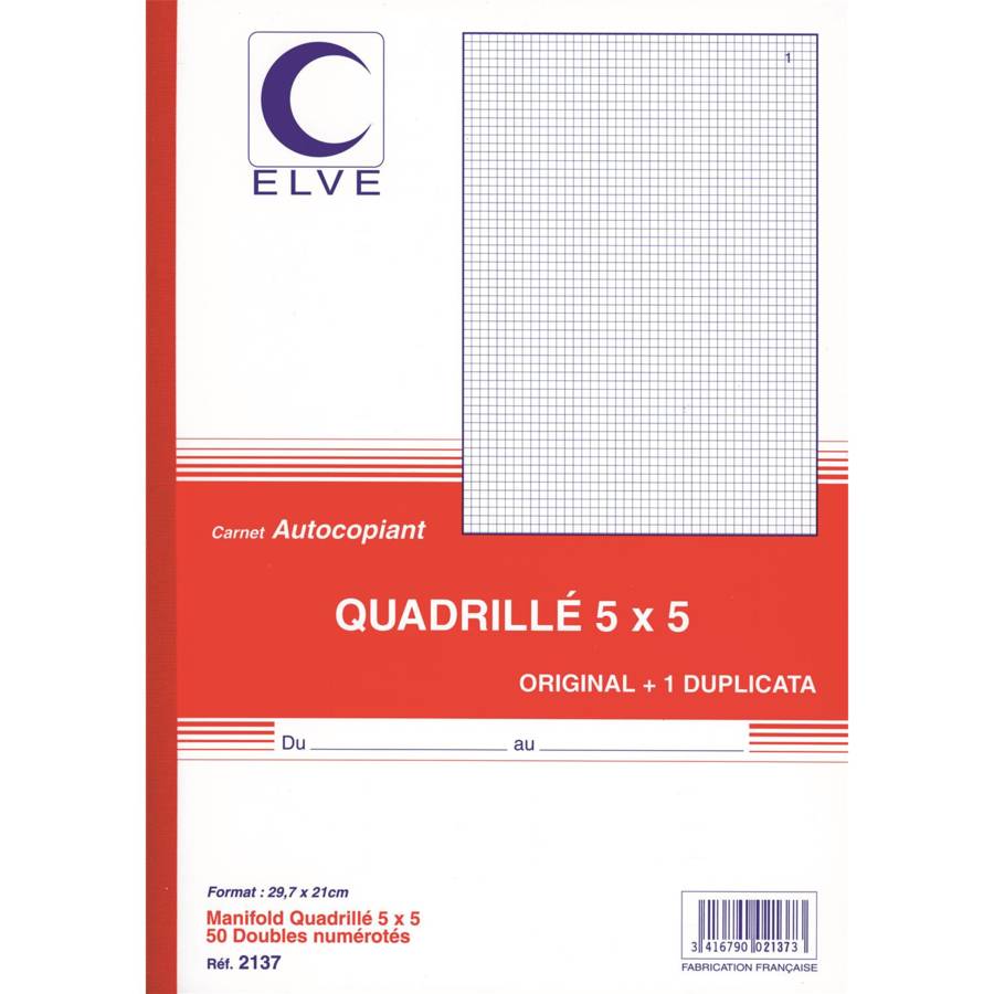 Elve - Manifold Autocopiant Quadrillé 5 x 5 297 x210 mm 50 Feuillets Dupli