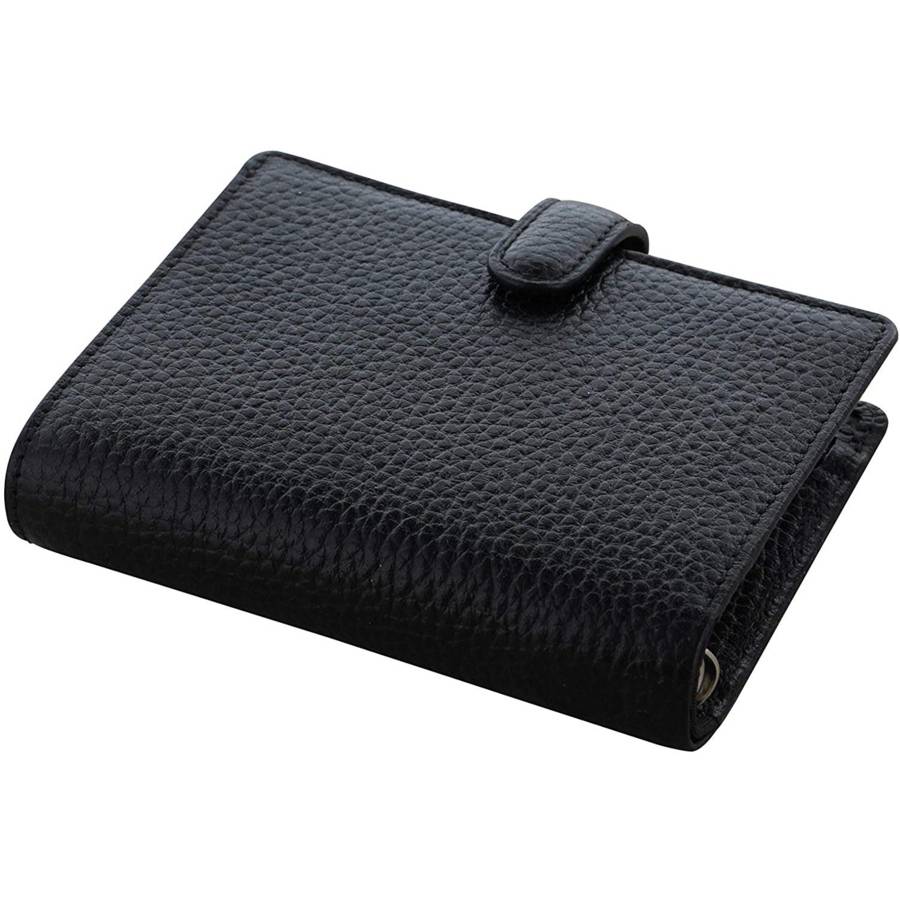Couverture rigide en cuir de vachette grainé - coins arrondis - dos cousu - fermeture patte pression - une pochette intérieure zippée et emplacements cartes - un passant pour stylo