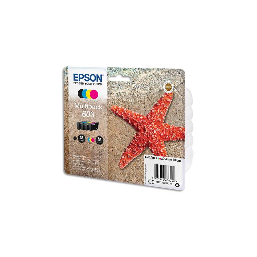 Pack 4 Cartouches Jet d'Encre N° 603 Cyan Magenta Jaune Noir Rendement : 150 pages noir, 130 pages couleurs (Norme ISO/IEC 24711 ET 24712) Grâce à la combinaison d'encres à colorant et d'encre pigmentée noire, cette gamme d'encres crée des impressions détaillées et colorées