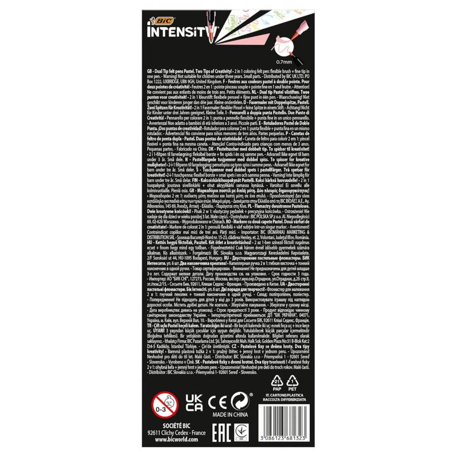 Pack durable 6 BIC INTENSITY BRUSH 2 en 1 PASTEL Double pointe - 1 pointe pinceau et 1 pointe fine - Couleurs pastels: rose-violet-jaune-vert-bleu-pêche Etui x 6 feutres double pointe pour calligraphie et prise de notes - 1 pointe pinceau pour des traits larges, et 1 pointe fine pour l'écriture - Encre à base d'eau - Couleurs pastels: rose-violet-jaune-vert-bleu-pêche