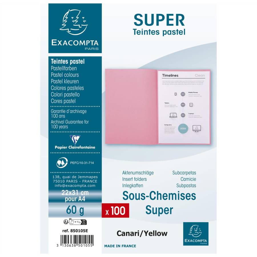 Paquet de 100 sous-chemises SUPER 60 - 22x31cm Les sous-chemises sont destinées à séparer en plusieurs sections les dossiers contenus dans une chemise. Comme des intercalaires, les couleurs permettent ainsi d'identifier facilement les différentes sous-parties. Les sous-chemises SUPER 60 sont un premier prix de qualité qui permet de classer en sous-dossier à prix budget. De coloris pastel, elles sont assorties aux chemises SUPER mais aussi aux chemises recyclées FOREVER®. Le papier 60g/m2 est résistant, il est certifié PEFC, issu de forêts gérées durablement. Le papier est fabriqué localement dans les usines du Groupe Exacompta-Clairefontaine.