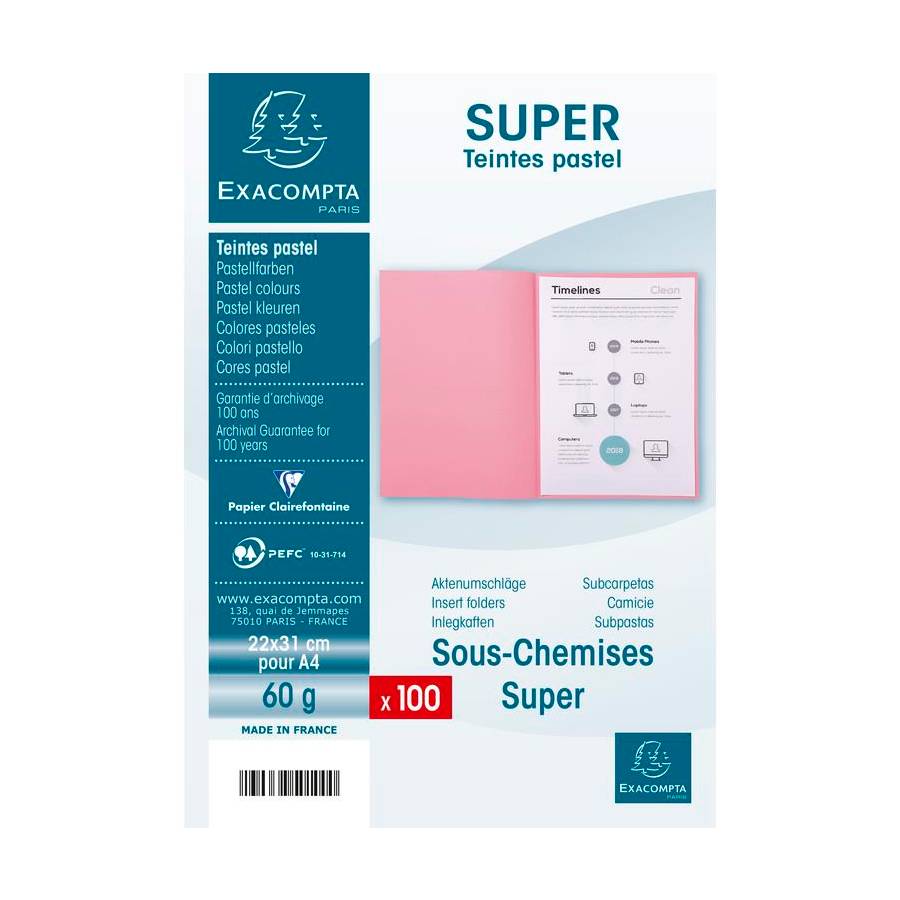 Les sous-chemises sont destinées à séparer en plusieurs sections les dossiers contenus dans une chemise. Comme des intercalaires, les couleurs permettent ainsi d'identifier facilement les différentes sous-parties. Les sous-chemises SUPER 60 sont un premier prix de qualité qui permet de classer en sous-dossier à prix budget. De coloris pastel, elles sont assorties aux chemises SUPER mais aussi aux chemises recyclées FOREVER®. Le papier 60g/m2 est résistant, il est certifié...