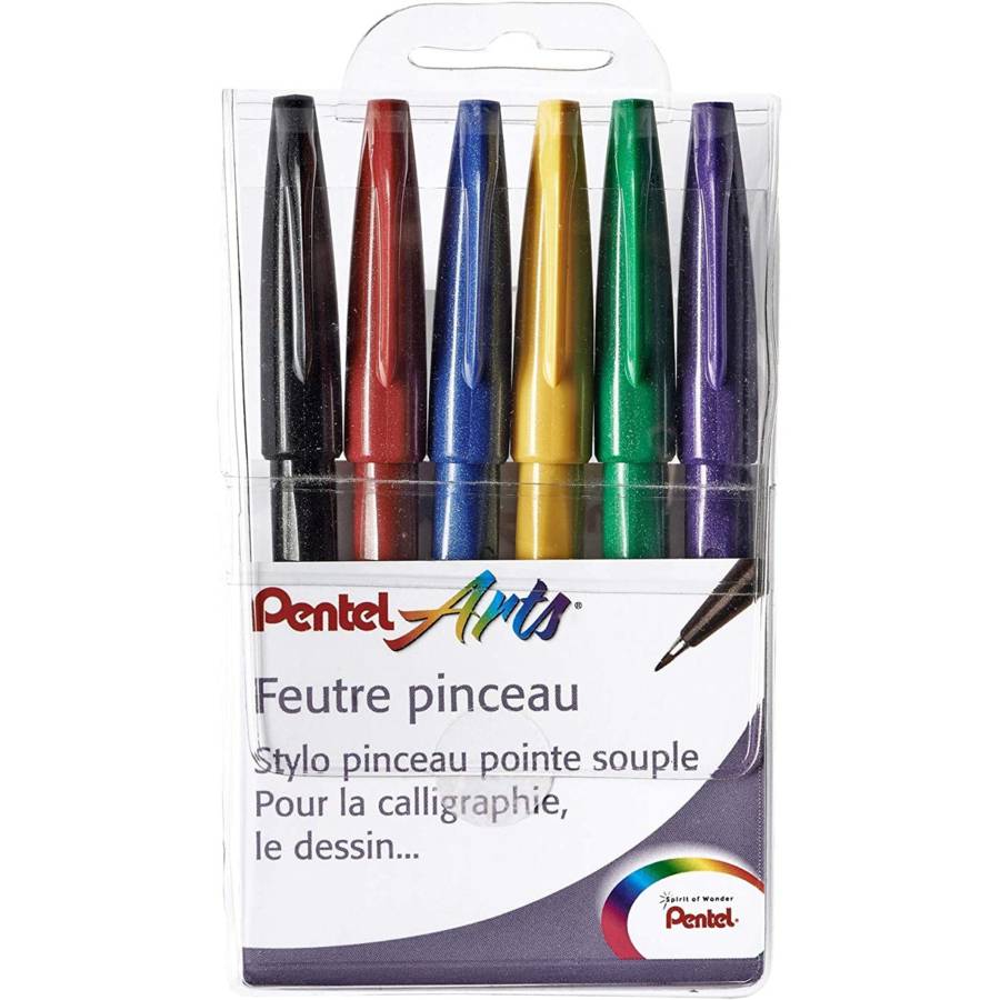 Pochette de 6 Feutres pinceau Brush Sign Pen : 1 x Noir, 1 x Rouge, 1 x Bleu, 1 x Vert, 1 x Violet, 1 x Jaune