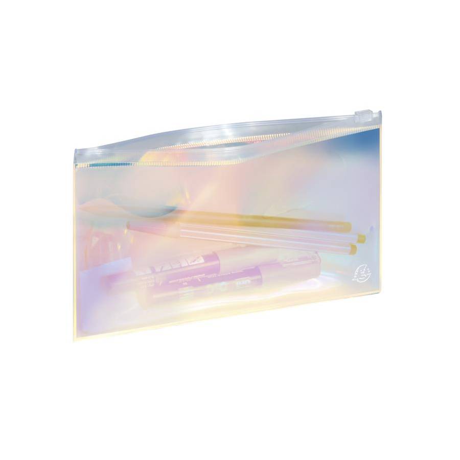 Une pochette plate très pratique et aux reflets iridescents tendances ! PVC holographique transparent, fermeture par zip plastique Pour ranger crayons/stylos, papiers, smartphone etc, et à glisser dans son sac à main ou son cartable.