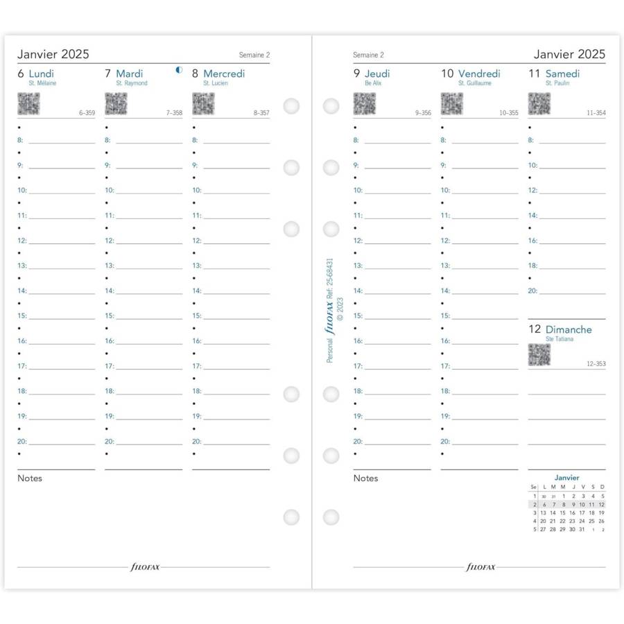 Recharge pour agenda Personal Semaine sur deux pages - Francais- colonne - 2025