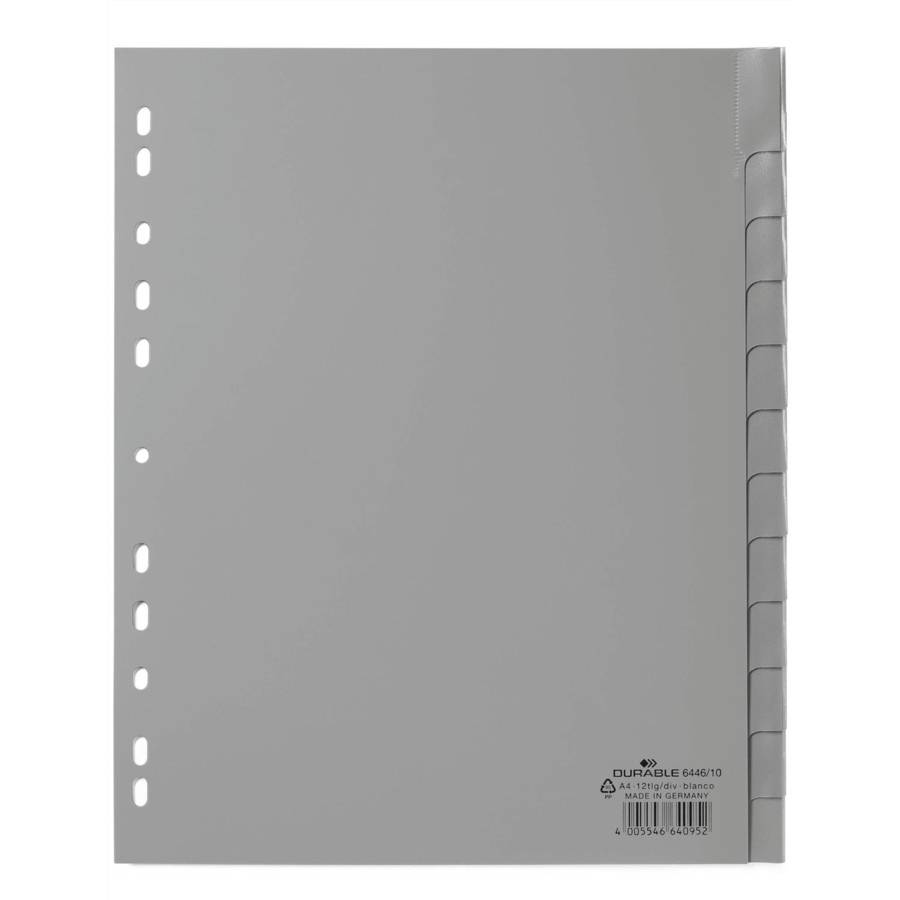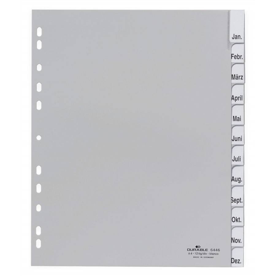 Intercalaires avec onglets soudés et insertions bristol remplaçables Avec insertions bristol imprimées et insertions bristol supplémentaires vierges Insertions bristol vierges pour l'identification professionnelle avec DURAPRINT® Division/feuille : 1-12, Jan.-Dez. Perforation universelle Pour le format : extra-large pour pochettes perforées transparentes A4 portrait Dimensions : 297 x 230/245 mm