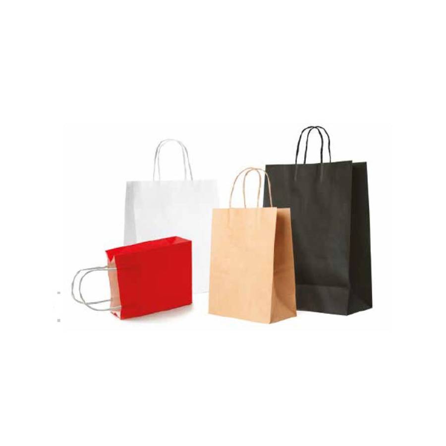 Sac en papier, avec poignées torsadées 100% papier kraft recyclable, 80 g/m² volume : 3,5 litres dimensions: (L)180 x (P)80 x (H)240 mm Le sac à poignée kraft est de plus en plus présent dans la vie quotidienne des consommateurs. Il est nécessaire pour contribuer à la protection de l'environnement en évitant l'utilisation des sachets plastiques comme emballages de produits des clients.